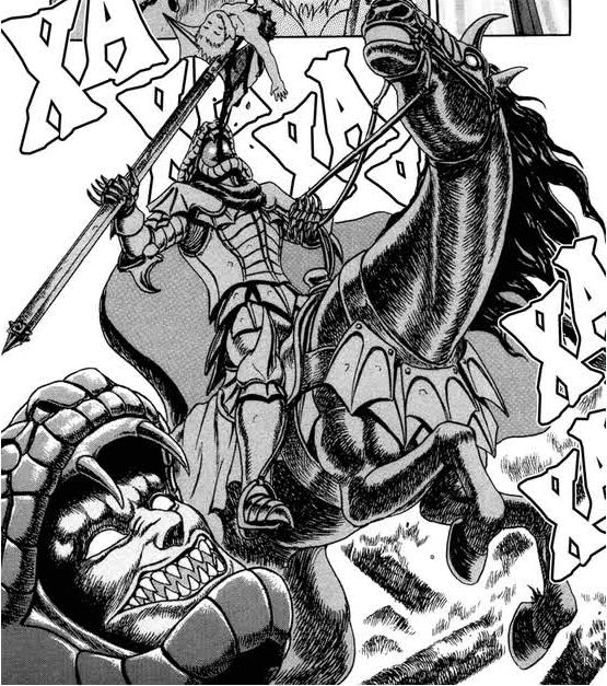 Мэр предлагает больше золота и людей, чтобы барон простил его за случай в таверне. Но Змей обвиняет мэра в том, что он печется за свою жизнь так, что готов продать душу дьяволу. Ему это надоело и приказывает сжечь город. Барон-змей и его бандиты опустошают город, но в это время появляется защитник, черный мечник. Завязывается жестокая схватка, в которой Гатс убивает барона-змея. Во время боя с Гатсом, Барон убивает всех своих людей.