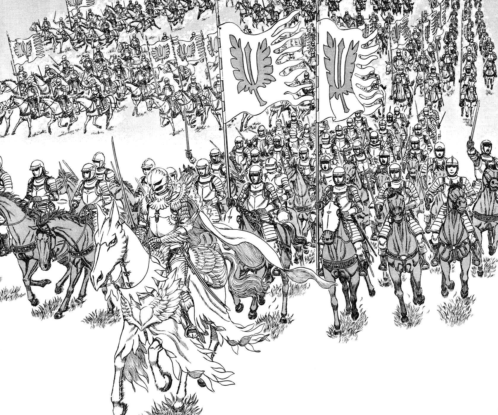 «Отряд сокола» продолжает освобождать Мидленд от кушанской оккупации, выступая в качестве самой выдающейся силы сопротивления королевства. Вскоре после этого Гриффит нанимает юную провидицу Соню, которая действует как медиум группы, и благородного Мьюл Вулфлейм, первая из-за ее даров телепатии и наблюдения на всем поле боя, а вторая - за добавление его остатки силы сопротивления человеческой кавалерии отряда.