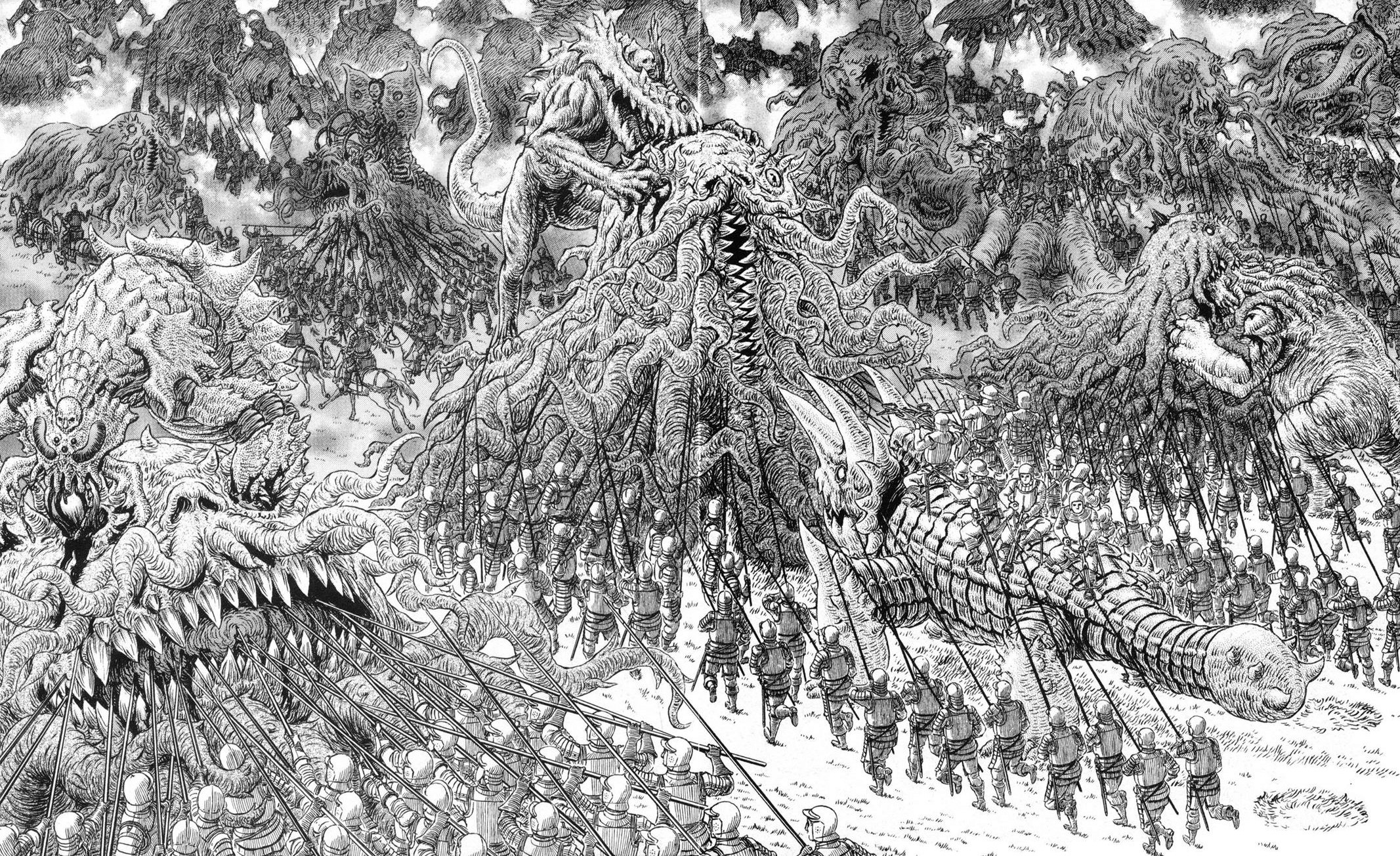Раздосадованный своим предыдущим актом подчинения, Ганишка спускается в свой рукотворный бехерит и перевоплощается во второй раз, в результате чего принимает обтягивающую небо, демоническую форму зверя и уничтожает Виндема под своими ногами. Отряд боевых демонов Сокола встречается с недавно сформированным отродьем императора, принимая свои истинные демонические формы, чтобы должным образом сражаться с наступающими врагами. Когда стало известно о том, что Гриффит командует такими чудовищными существами, люди из группы начинают сомневаться в истинной природе своего командира. Соня телепатически напоминает им, что Демоны Войны - это те, кто сражается и истекает кровью за свое дело, поскольку они бездействуют, и что, будь они людьми или апостолами, все они являются членами Отряда Сокола, таким образом обновляя чувство единства группы. Вместе человек и апостол Соколы сражаются с отродьем, пока Гриффит и Зодд поднимаются к голове Ганишки. Там Гриффит (в его форме Руки Бога Фемто) попадает в засаду Рыцаря-Черепа и использует раздирающий пространство удар мечом потенциального убийцы, чтобы разрезать дважды перевоплощенную форму Ганишки, тем самым вызывая Великий Рев Астрального Мира и проявление Мирового Спирального Древа вместо императора. Вскоре после этого он снова появляется на вершине Зодда, чтобы направить свои силы в его недавно сформированный город Фалькония.