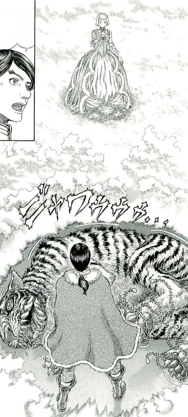 После приговора Пака и Магнифико к дню общественных работ, когда выясняется их совместный заговор с целью свергнуть ее, Дананн просит Гатса остаться, прося Ширке, Иварелу и Фарнезе сопровождать ее и Каску. Оказавшись в комнате, заполненной грибами, Дананн объясняет Фарнезе и Ширке, что ритуал «Коридор снов» требует от них астрального проецирования себя в разум Каски и путешествия по его закоулкам. Но Дананн предупреждает их, что мир человеческого разума - это более сложное место для перемещения по сравнению с астральным планом, когда Ширке и Фарнезе входят в мир снов Каски после того, как их успокоили. Две женщины изначально находят, что сказочный пейзаж Каски представляет собой серию детских каракулей с затемненным силуэтом, предназначенных для представления Гатса, ведомых лепестками Дананн к месту назначения: мысленное воссоздание Затмения.