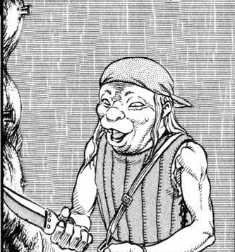 Deg is a perverted and cowardly man who took a fancy to Jill and showed no compunction over molesting her until she resisted.[1] He is described by his comrades as "pathetic" and after Deg expresses interest in recreating a folk ritual that would have killed Jill they view him as being insane.[1] When terrified by the sudden presence of Guts, Deg resorts to threatening him with violence despite his cowardly attitude.[1]