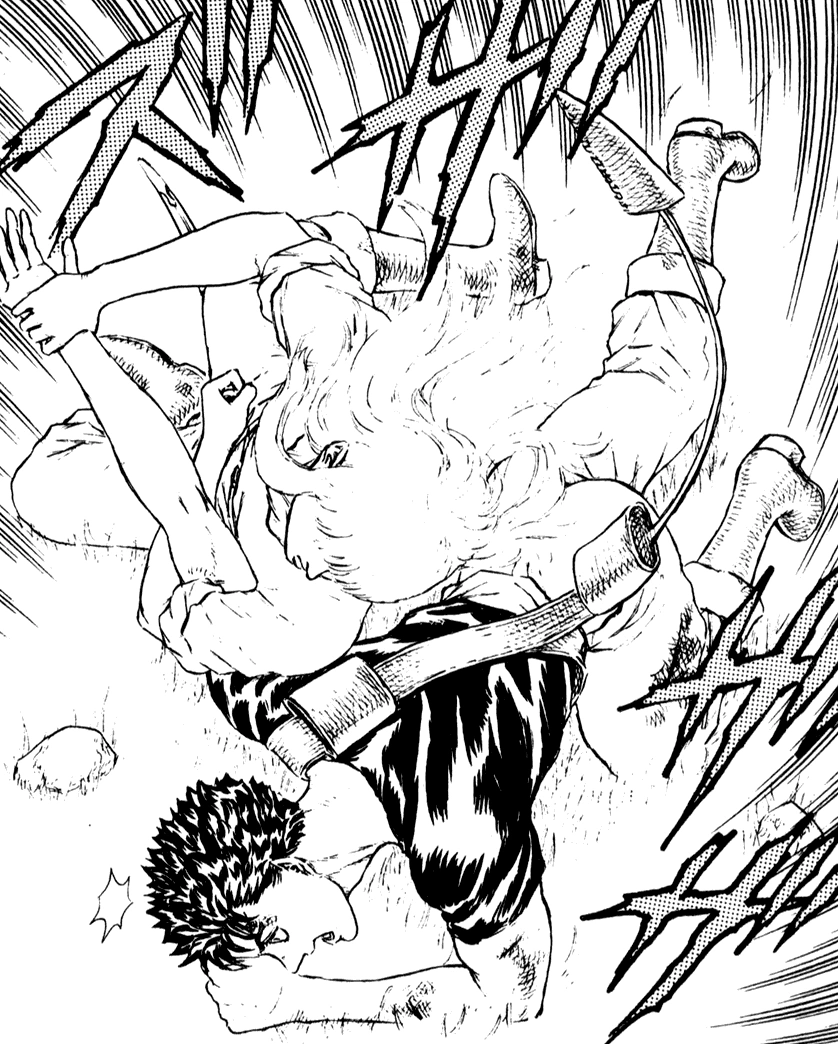 After clamping his teeth on Griffith's weapon, Guts uses this to unsettle his sword and the two tumble down the edge of the hill with Guts on top as he proceeds to punch and kick Griffith. As the spectators line the top of the hill, they all expressed various degrees of surprise that someone actually knocked Griffith down. But a lull in the attacks gives Griffith a chance to recover as he counters Guts' next punch and places him in an armlock. When Guts refuses to submit, Griffith is forced to dislocate Guts' shoulder and wins the fight. He tells Guts that he now owns him, and Casca leaves, jealous that Griffith had never taken such a personal interest in her, or anyone else.