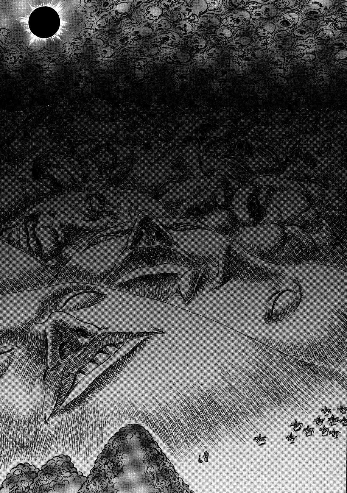 The rest of the band is not far behind Guts, running on horseback to reach Griffith. All at once, the band, Guts and Griffith notice an odd phenomenon happening in the sky; a black circle slowly encroaching upon the sun: a solar eclipse. The blood from Griffith's neck has slowly run down his arm and made contact with his beherit, which begins to open its eyes.
