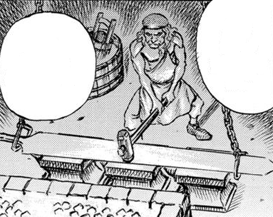 Being a passionate blacksmith to the very end, Godot chose to repair Guts' equipment while he still had the strength to stand.[3]